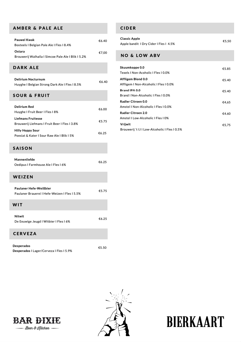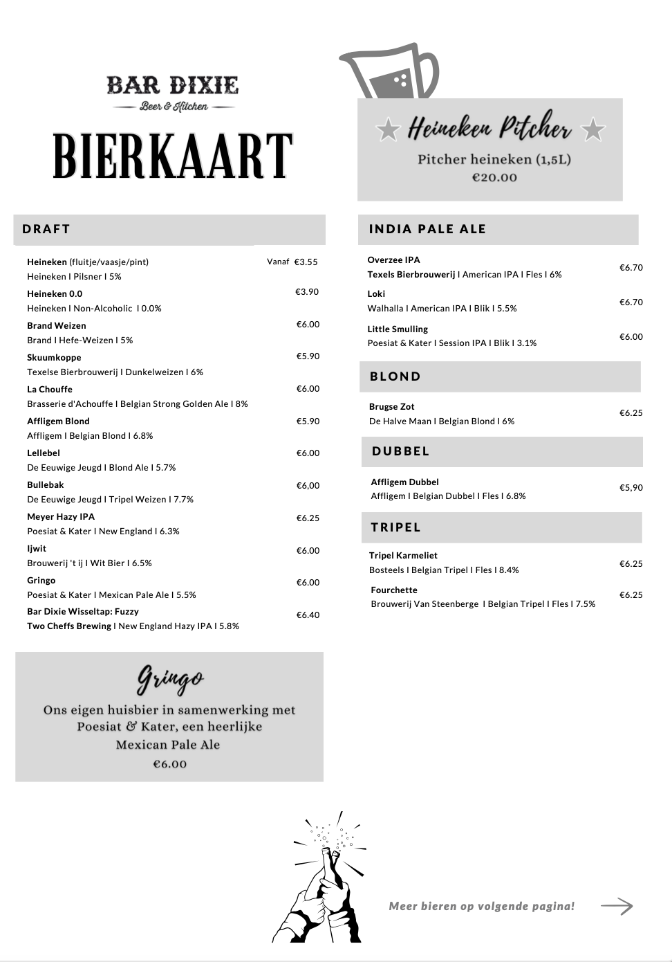 Bar Dixie onderscheidt zich door de uitgebreide bierkaart met zowel bekende merken als lokale favorieten, de wekelijkse wisseling van speciaalbieren, en de ontspannen sfeer op ons verwarmde terras.