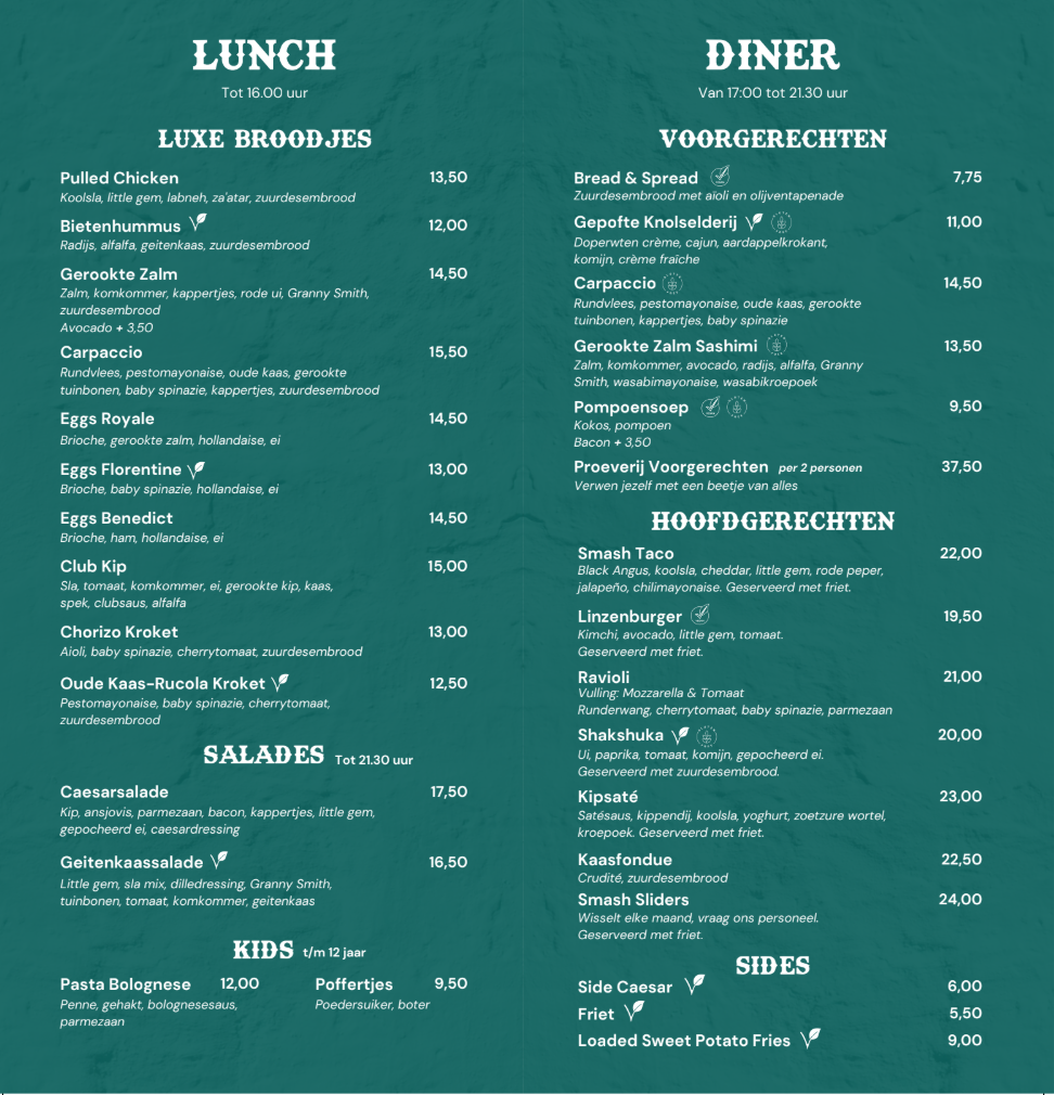 Onze kaart bevat diverse vegan en vegetarische gerechten, zoals de vegan Linzen Burger en de Shakshuka. Al onze gerechten zijn bereid met verse ingrediënten en zonder kunstmatige toevoegingen. Vraag ons team gerust om hulp bij het maken van een keuze! We verwelkomen je graag om lekker te komen genieten van een diner of lunch in Amstelveen.