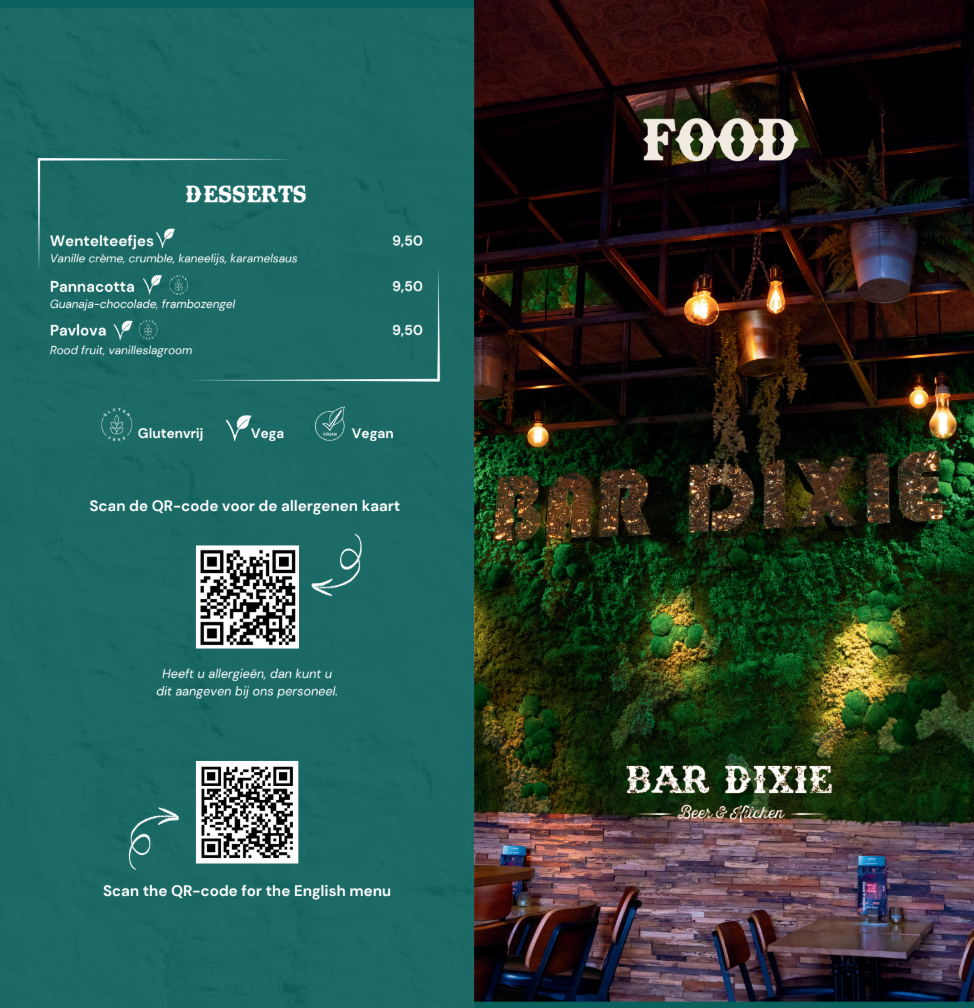 Op zoek naar een heerlijke lunch in Amstelveen? Bij Bar Dixie geniet je van smakelijke gerechten zonder poespas, borrelhapjes en diners in een ongedwongen sfeer. We serveren (h)eerlijke gerechten met invloeden uit de Oosterse, Franse, Italiaanse en Amerikaanse keukens. Smakelijk en puur, zonder opsmuk. Bovendien hebben we diverse vegetarische en vegan opties. Je kunt van zowel de lunch als het diner genieten in ons gezellige restaurant of op ons overdekte én verwarmde terras.